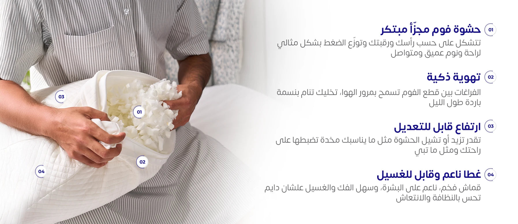 - تقنية الفوم المجزء: تمنح توازن مثالي بين المرونة والدعم وتتكيّف مع شكل الرأس والرقبة.